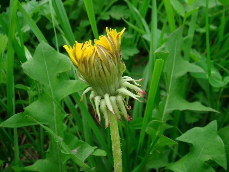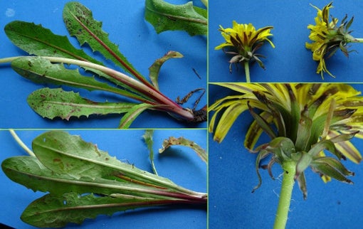 8. Bloemen zonder stuifmeel. Helder geel. Buitenste lintbloemen zijn vaak gootvormig. Bladeren donkergroen. Bladstelen zijn donkerrood van kleur.....................................Noordelijke paardenbloem Sectie Borea Sahlin