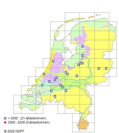Verspreiding: Heeft in NL een klein areaal van Zuidwest -Friesland tot de noordelijk Veluwe kust. Zeldzame soort.