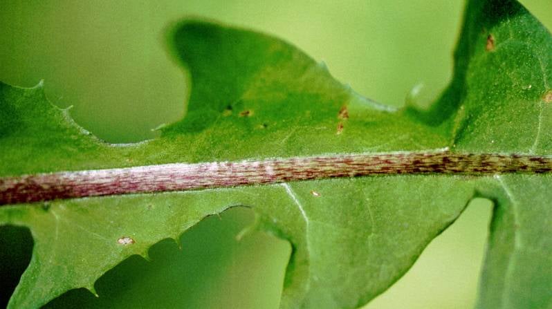 Bladsteel rose en iets gevleugeld. Middennerf bruinachtig van kleur. Zijlobben staan af, 5-8, voorkant bovenste zijlobben ongetand, rest zijlobben dicht lang getand. Achterkant zijlobben met een enkele grote tand. Interlobben getand met een gekleurd randje. Eindlob driehoekig met een enkele stompe tand. Buitenste omwindselblaadjes afstaand tot iets teruggekromd, niet gerand.