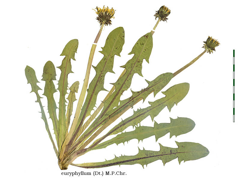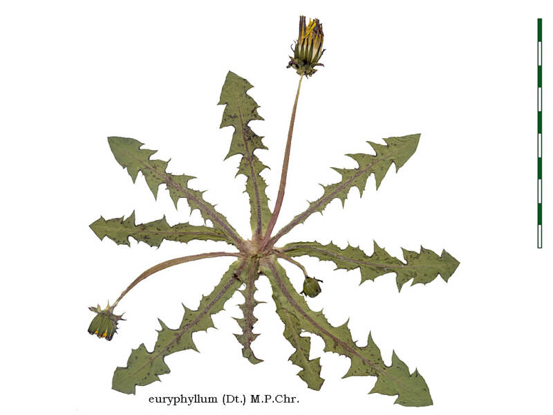 De bladeren van Taraxacum euryphyllum (Dahlst.) Christ. zijn sterk behaard. Bladsteel is sterk purperrood. De middennerf is sterk roodachtig gekleurd. Het bladoppervlak met vele violette vlekken. Zijlobben ( 4-7) afstaand tot iets teruggekromd. De zijlobben zijn sterk driehoekig met een zeer spitste top. Niet of weinig getand. Interlobben zijn vrij breed ( tot 8 mm). De eindlob is langwerpig helmvormig met een stompe top.Bloemsteel vaak behaard. Buitenste omwindselblaadjes zijn teruggekromd tot iets afstaand donkergroen en zwak gerand. Bloemhoofdjes zijn stralend tot 4 cm in diameter. Buitenste lintbloemen aan de onderzijde violet gestreept. Stuifmeel ontbrekend!..........................................................................Taraxacum euryphyllum (Dahlst.) Christ.
