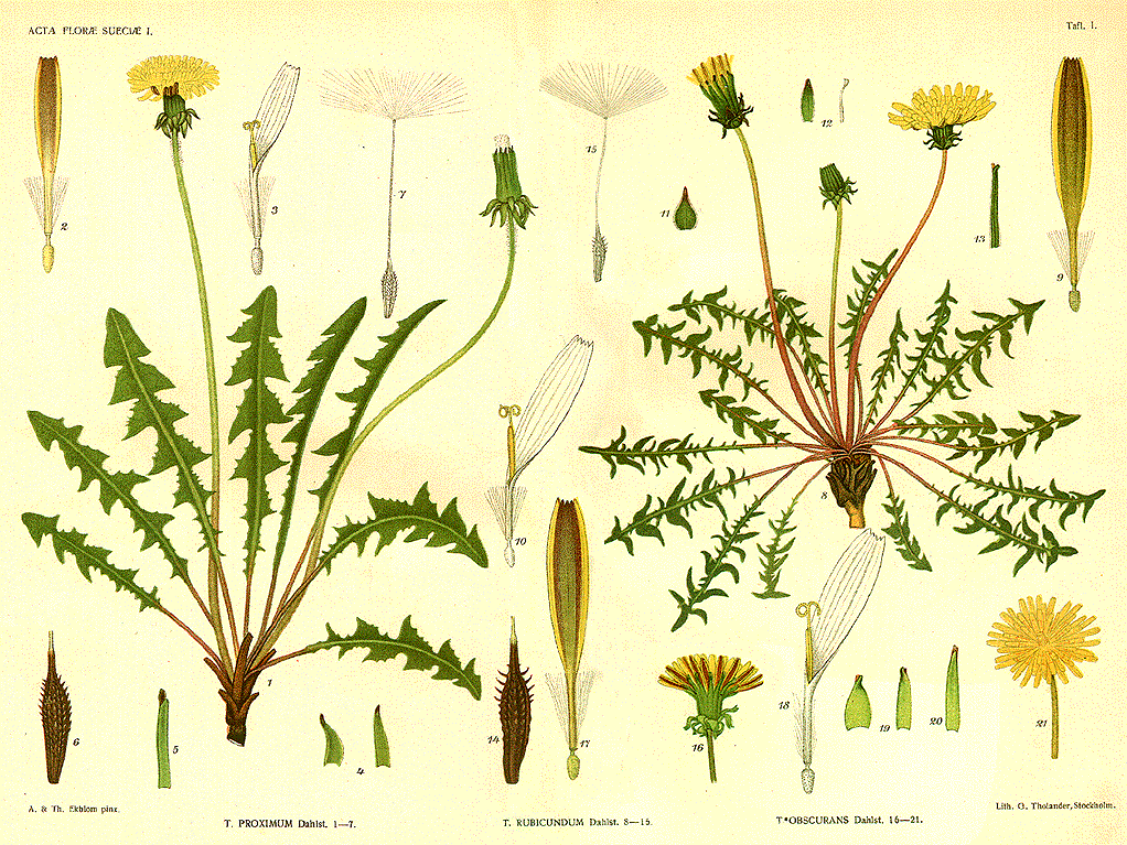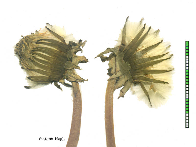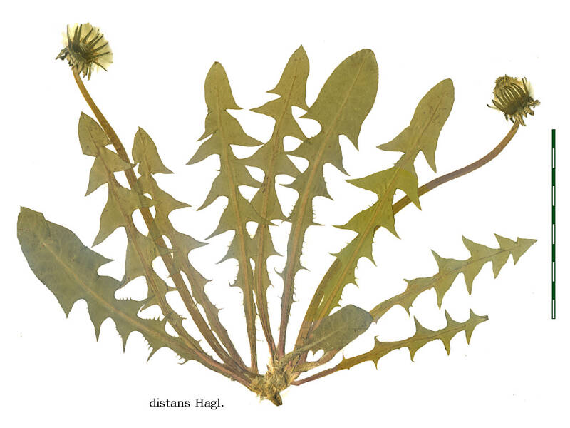 1. Bladsteel iets gevleugeld. Zijlobben afstaand, 3-4, kort driehoekig, versmald in een korte scherpe top, De meeste zijlobben zijn niet getand, onderste soms met enkele kleine tanden op de bovenkant. Eindlob meestal verlengd pijlvormig en een duidelijk topje. Interlobben soms met een lange tand, iets geplooid. Omwindsel meer dan 3,5 mm breed, niet gerand, teruggekromd. Bloemknop sterk berijpt...................................Taraxacum distans Hagl. (Fig. 1,4,6 )